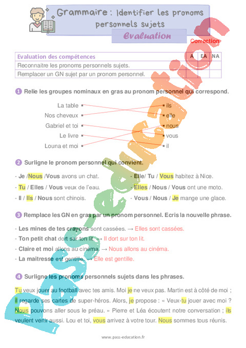 Evaluation Correction CE1 Identifier les pronoms personnels sujets rtf