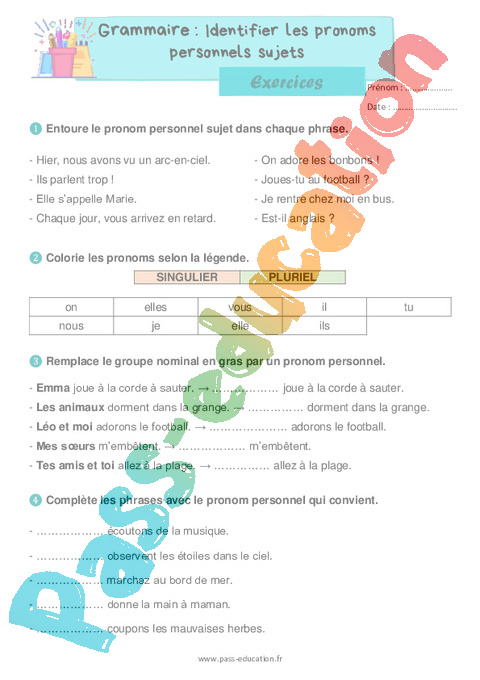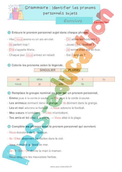 Exercices Correction CE1 Identifier les pronoms personnels sujets pdf