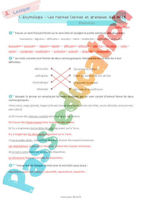 Correction Les racines latines et grecques en français – Exercices de vocabulaire 6ème rtf