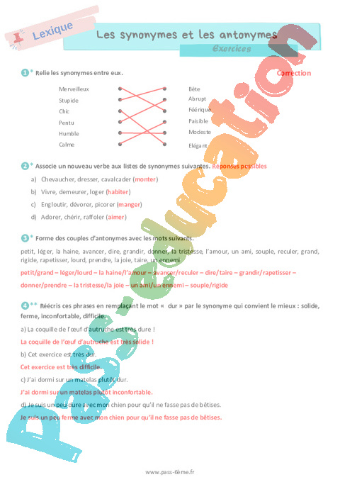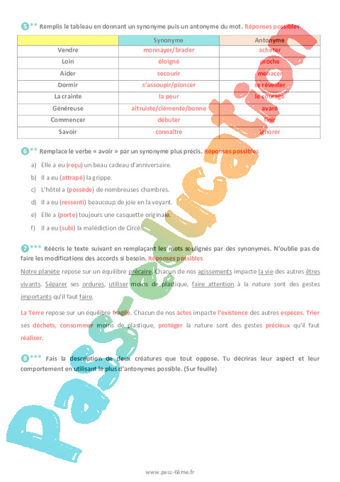 Correction Les synonymes et les antonymes – Exercices de vocabulaire pour la 6ème pdf