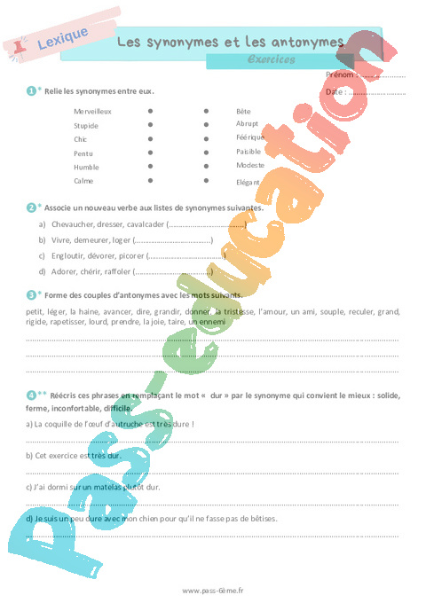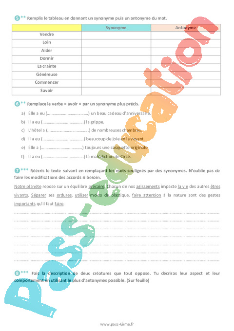 Les synonymes et les antonymes – Exercices de vocabulaire pour la 6ème pdf
