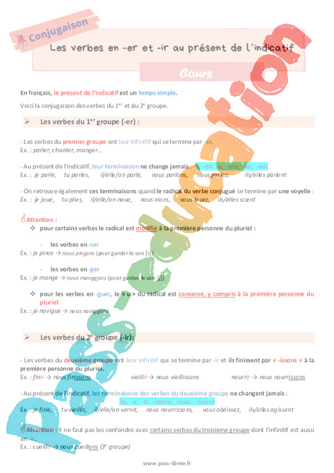 Cours de conjugaison pour la 6ème sur les verbes en er et les verbes en ir au présent.