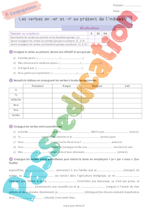 Evaluation Les verbes en er et les verbes en ir au présent 6ème pdf