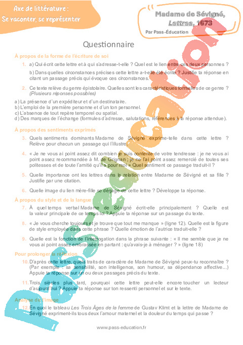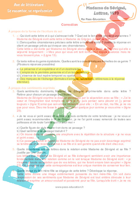 Correction Questionnaire Mme de Sévigné, Lettres, 1673 – 3ème pdf