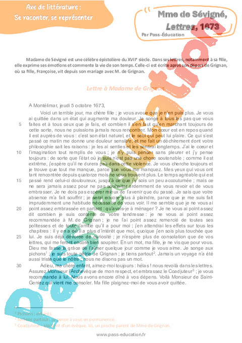Littérature Mme de Sévigné, Lettres, 1673 – 3ème pdf