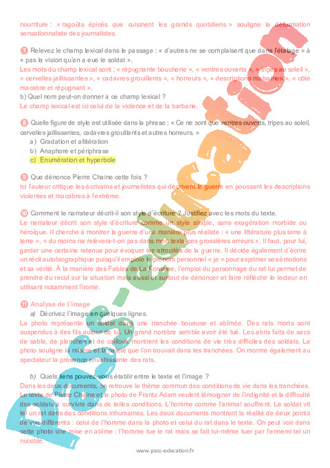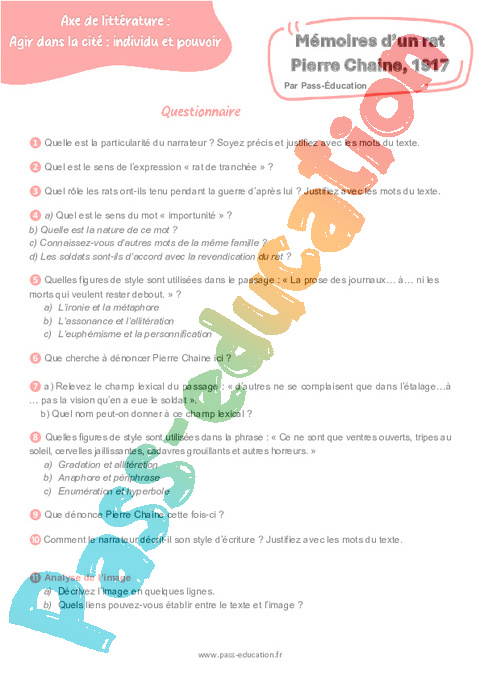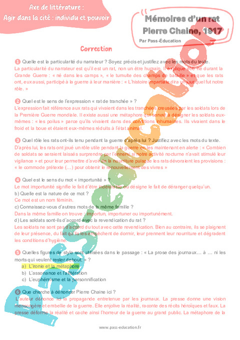 Correction Questionnaire Mémoires d’un rat (Pierre Chaine) 1917 – 3ème pdf