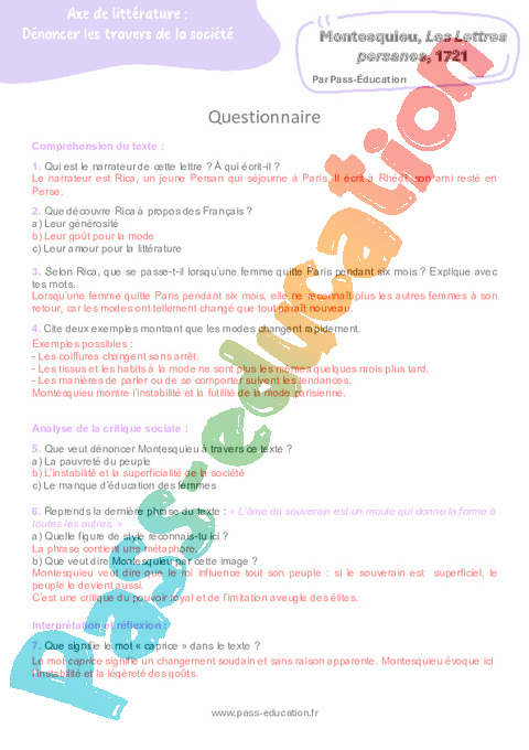 Correction Questionnaire Montesquieu, Les Lettres persanes, 1721 – 3ème pdf