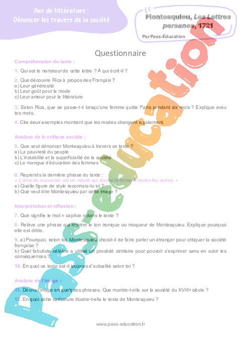 Questionnaire Montesquieu, Les Lettres persanes, 1721 – 3ème pdf