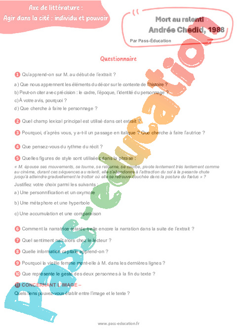 Questionnaire Mort au ralenti (Andrée Chedid) – 3ème pdf