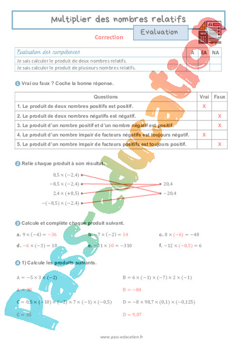 Evaluation Multiplier des nombres relatifs – 4ème Correction rtf