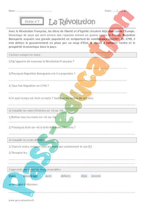 Correction La Révolution – Noms féminins en -té ou -tié – Cm1 – Dictée accompagnée n°7 pdf