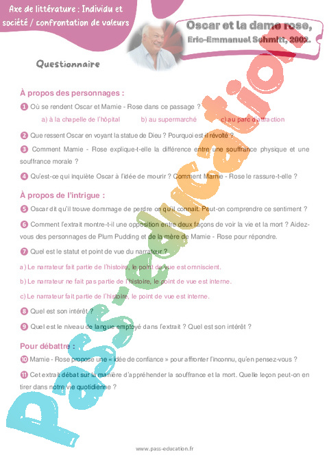 Questionnaire – 4ème Oscar et la dame rose (Eric-Emmanuel Schmitt) pdf