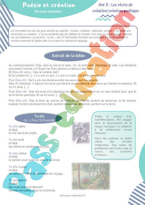 Le mot poète est issu du grec ancien qui signifie « auteur, créateur ; fabricant, artisan ». Le poète est donc bien un créateur : il ne se contente pas de célébrer le monde, il en crée un à son image, il donne vie aux éléments. Le poème « tu dis » de J.P Schneider fait écho aux premiers écrits de la Bible et montre comment le poète crée un univers en utilisant le langage.