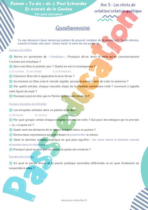 Questionnaire Poésie et création (Extrait de la bible) – 6ème pdf