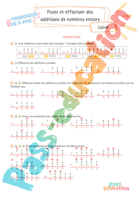 Correction Poser et effectuer des additions de nombres entiers – CM2 – Exercices Pas à Pas pdf
