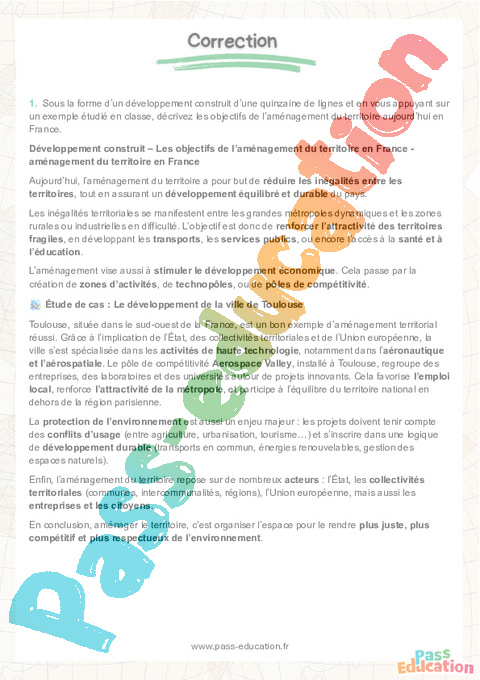1. Sous la forme d’un développement construit d’une quinzaine de lignes et en vous appuyant sur un exemple étudié en classe, décrivez les objectifs de l’aménagement du territoire aujourd’hui en France.