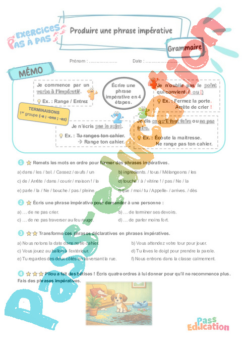 Exercices Pas à Pas avec mémo / leçon de grammaire pour travailler la compétence : produire une phrase impérative au CE2.