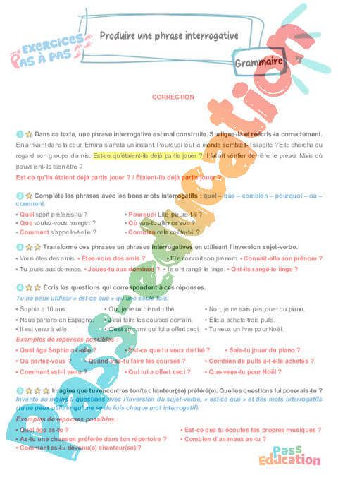 Correction Produire une phrase interrogative – CM2 – Exercices Pas à Pas pdf