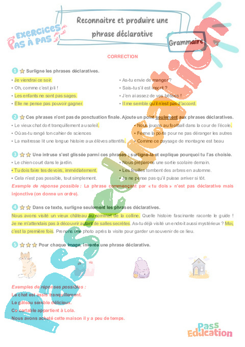 Correction Reconnaitre et produire une phrase déclarative – CM2 – Exercices Pas à Pas pdf