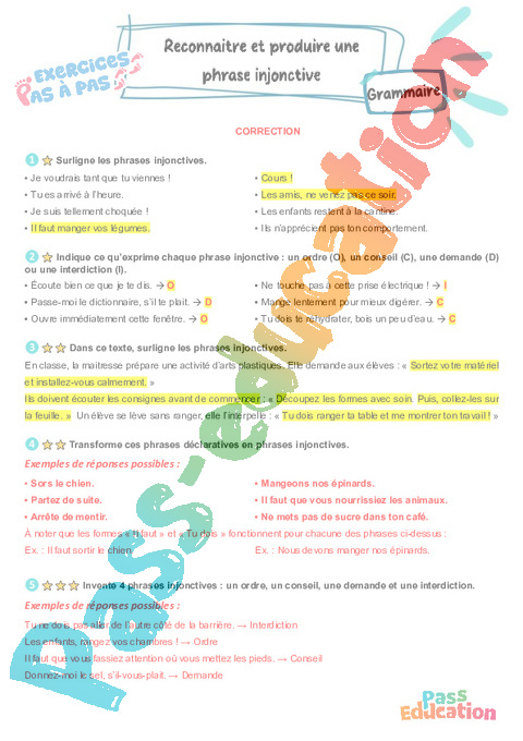 Correction Reconnaitre et produire une phrase injonctive – CM2 – Exercices Pas à Pas pdf