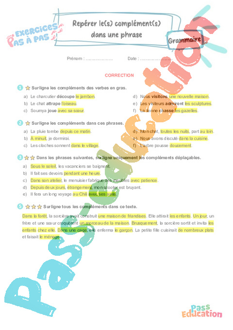 Correction Repérer le(s) complément(s) dans une phrase – CE2 – Mémo + Exercices Pas à Pas rtf