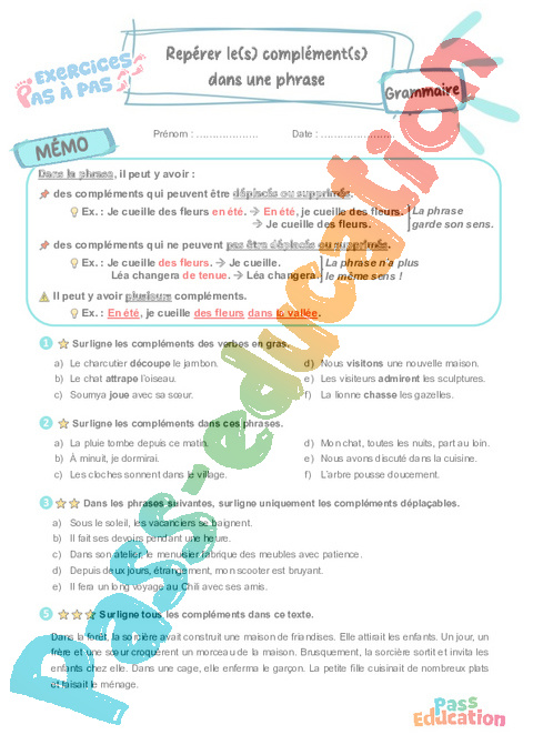 Exercices Pas à Pas avec mémo / leçon de grammaire pour travailler la compétence : repérer le(s) complément(s) dans une phrase au CE2.