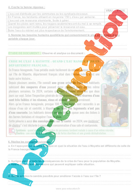 « Étude de documents » + exercices « Comment utilisons-nous l’eau en France et que faire pour préserver cette ressource ? »
