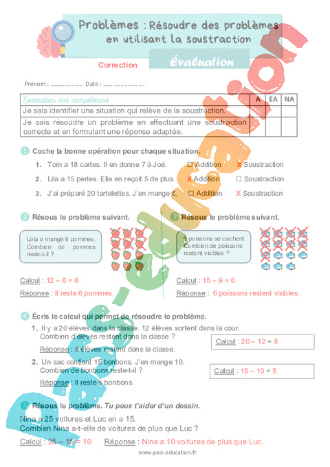 Correction Evaluation CE1 Résoudre des problèmes en utilisant la soustraction pdf