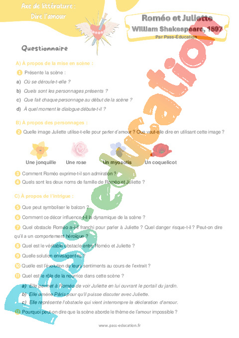 Questionnaire – 4ème Roméo et Juliette (William Shakespeare) pdf