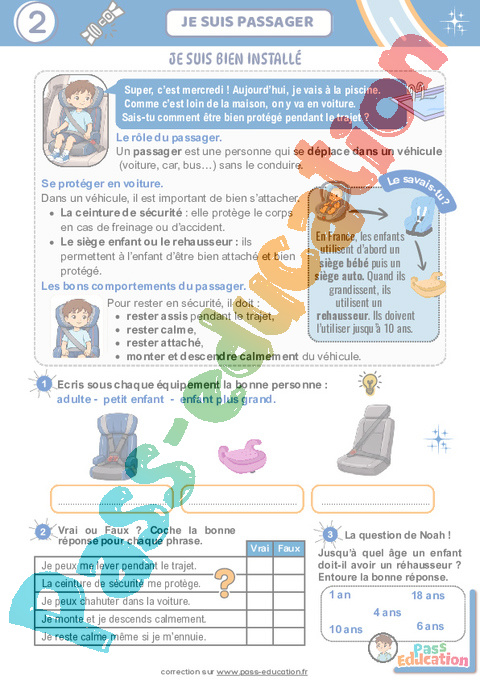 Super, c’est mercredi ! Aujourd’hui, je vais à la piscine. Comme c’est loin de la maison, on y va en voiture. Sais-tu comment être bien protégé pendant le trajet ?