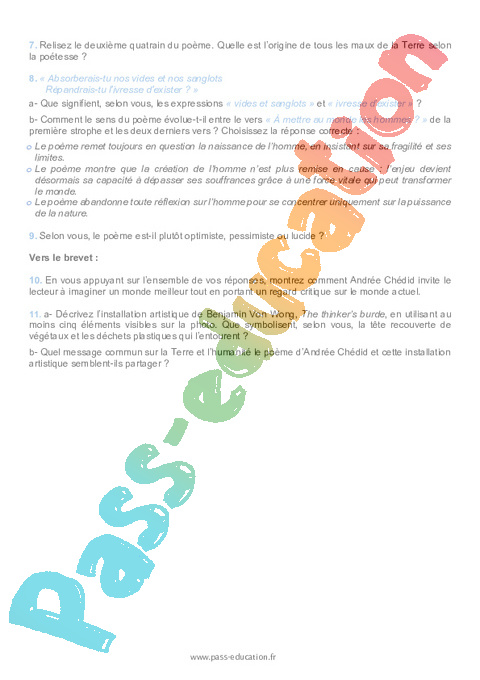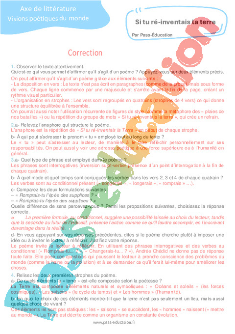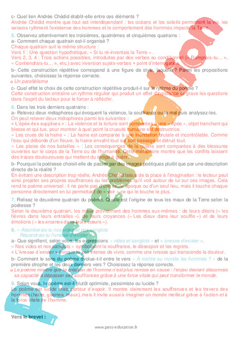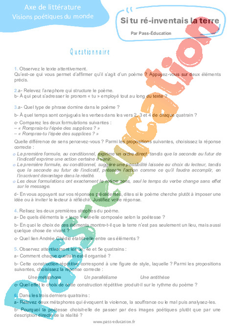 Correction Questionnaire Si tu ré-inventais la terre (Andrée Chédid) – 3ème pdf