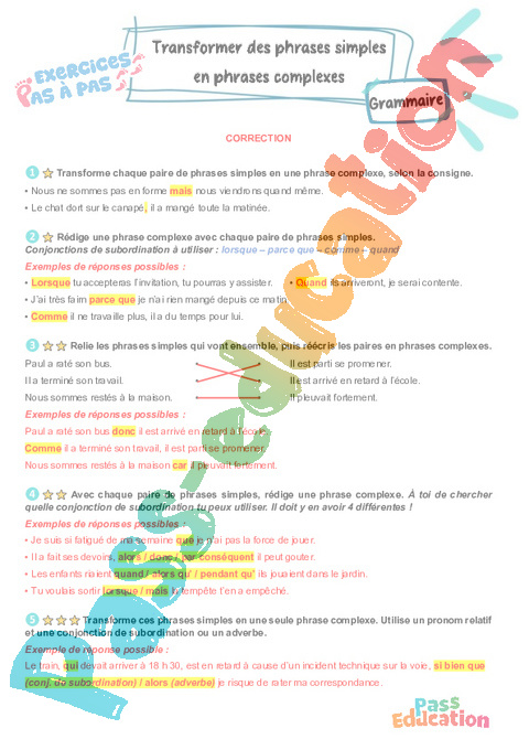 Correction Transformer des phrases simples en phrases complexes – CM2 – Exercices Pas à Pas rtf
