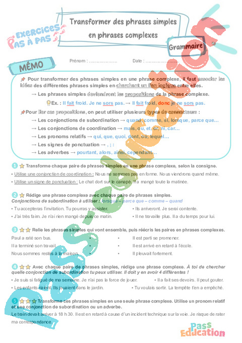 Exercices Pas à Pas avec mémo / leçon de grammaire pour travailler la compétence : Transformer des phrases simples en phrases complexes au CM2.