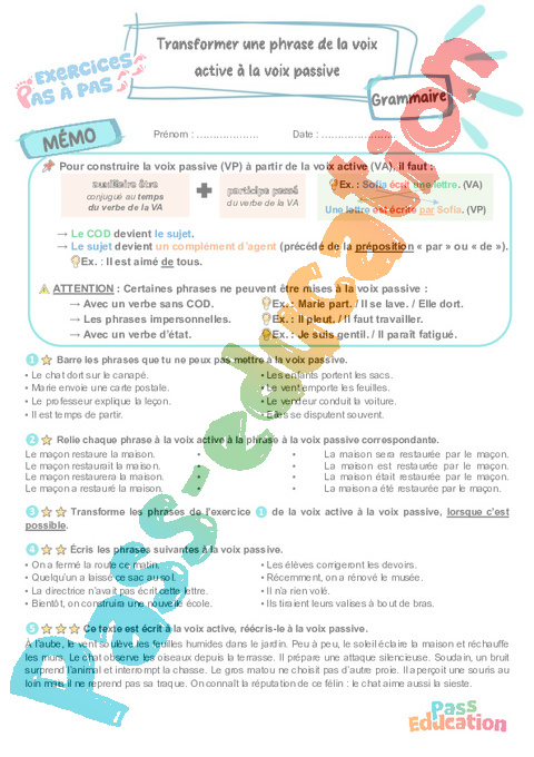 Exercices Pas à Pas avec mémo / leçon de grammaire pour travailler la compétence : Transformer une phrase de la voix active à la voix passive au CM2.