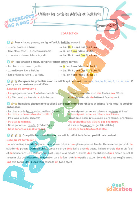 Correction Utiliser les articles définis et indéfinis – CE2 – Exercices Pas à Pas pdf