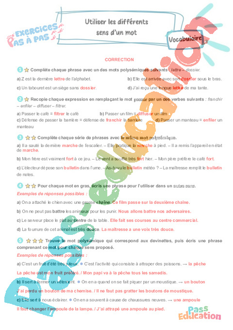Correction Utiliser les différents sens d’un mot – CM2 – Exercices Pas à Pas pdf