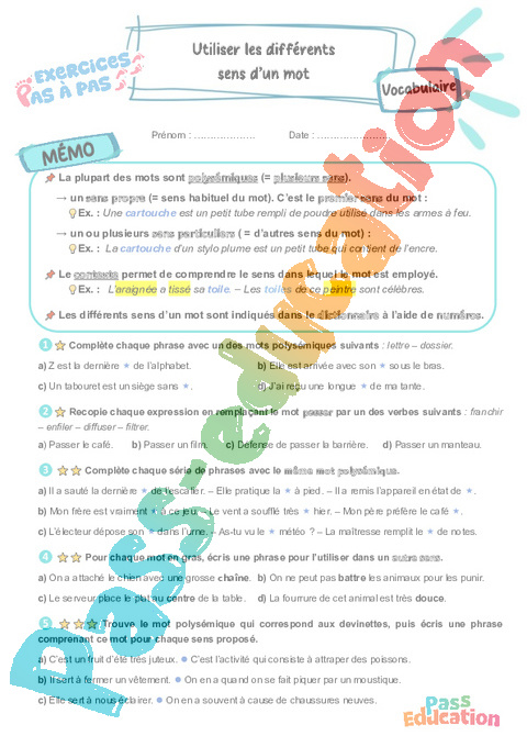 Exercices Pas à Pas avec mémo / leçon de vocabulaire pour travailler la compétence : Utiliser les différents sens d’un mot au CM2.