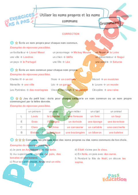 Correction Utiliser les noms propres et les noms communs – CE2 – Exercices Pas à Pas pdf